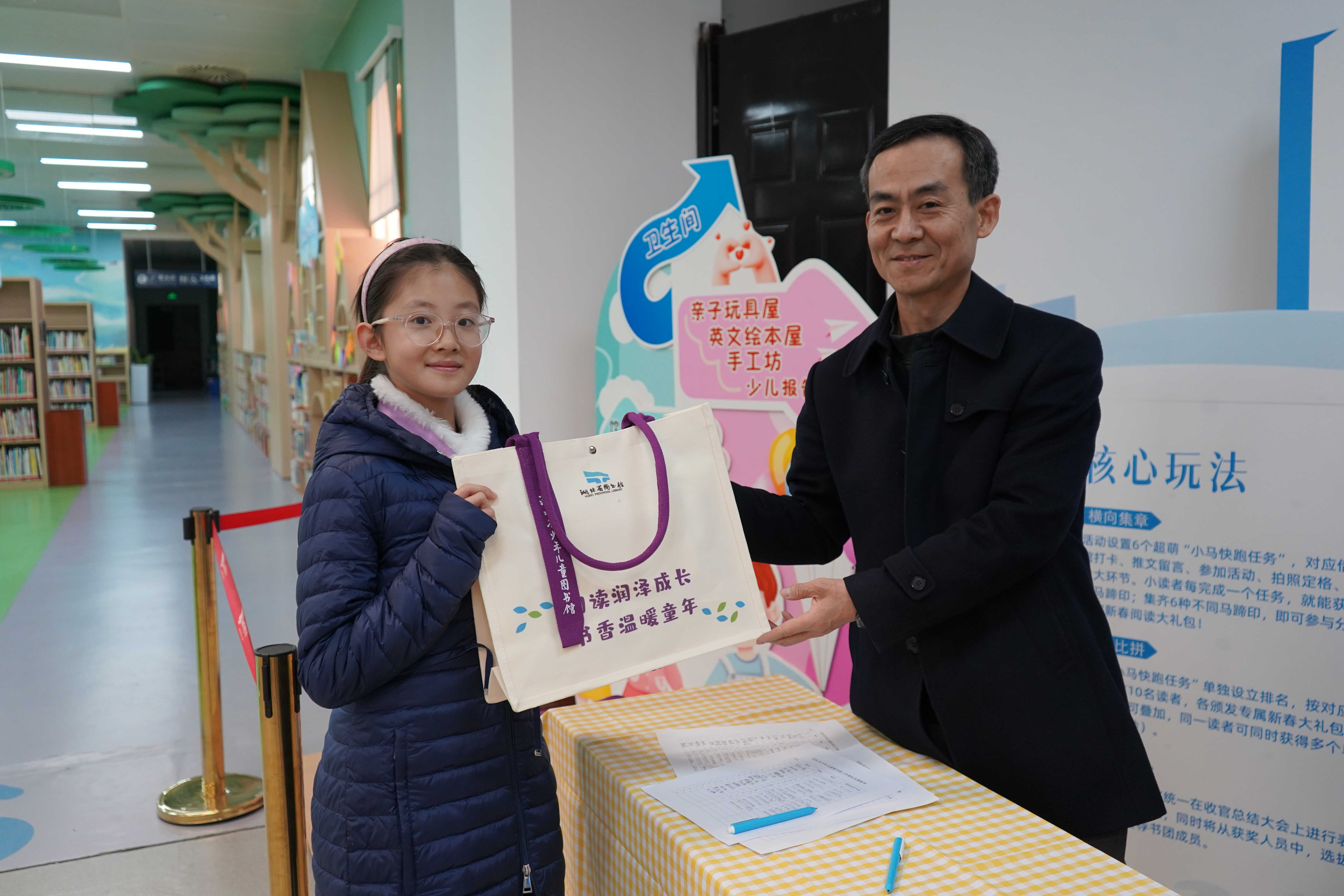 在一楼少年儿童图书馆,刘馆长俯身与到馆小读者亲切互动,送上蕴含知识和童趣的“少儿阅读大礼包”,鼓励他们在新的一年里以梦为马,不负韶华。