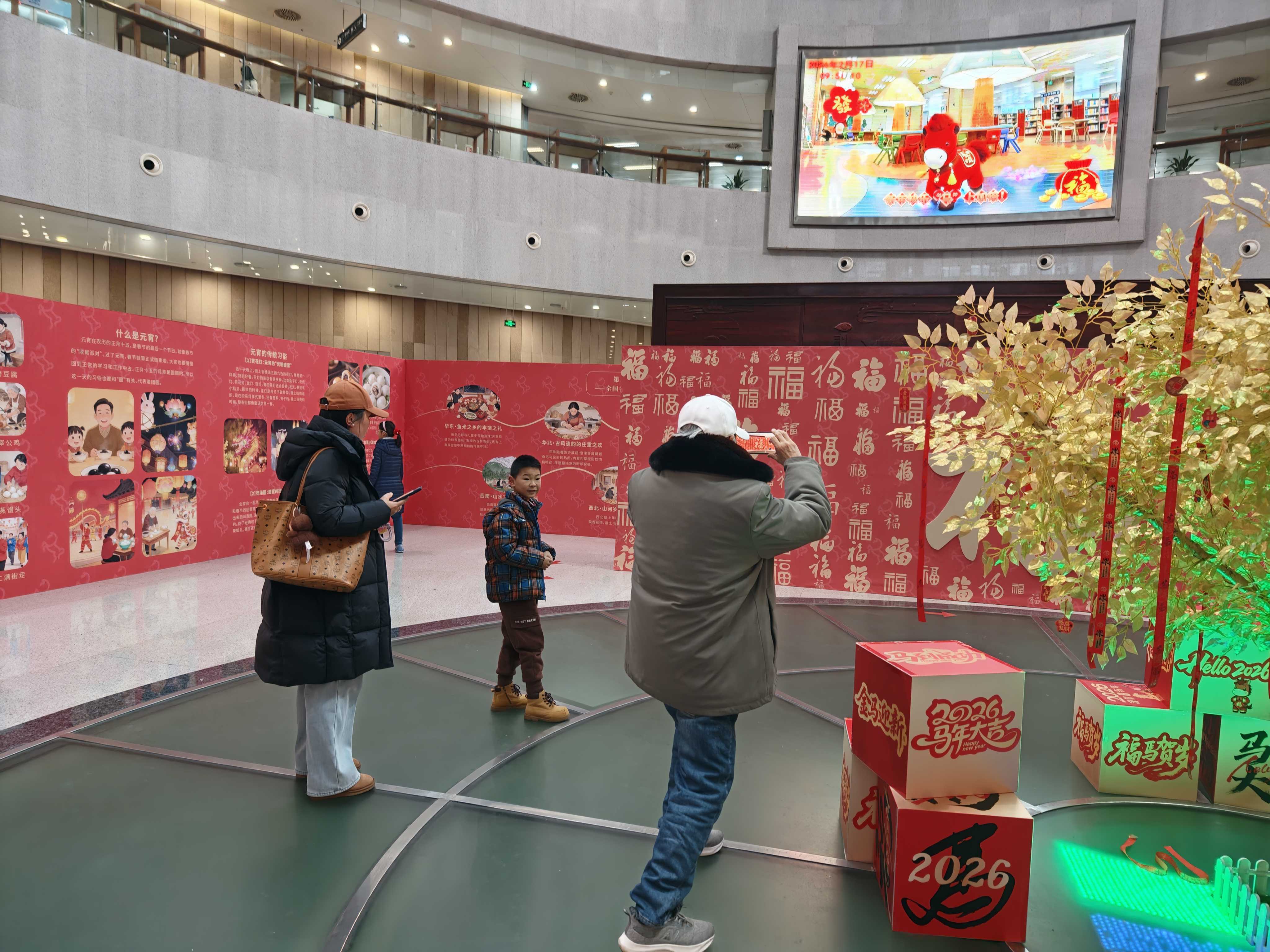 二楼大厅,“荆楚年俗传雅韵 春灯谜趣焕文光”新春文化展吸引了大批读者驻足。家长带着孩子在春节童谣前轻声为孩子介绍传统新春习俗;年轻读者则三五成群,在展板前轻声讨论,不时举起手机拍摄精美的年俗插画;老年读者指着老舍笔下腊八粥的段落轻声感叹:“这才是记忆里的年味。”展览撷取湖北年俗吉光,融灯谜之趣、非遗之雅,以书香传递楚韵,于体验中活化经典,让读者在雅俗共赏的阅读中,开启新一年的温暖与智慧。